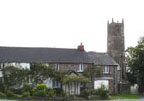 Pyworthy's St. Swithuns Church, started in 13th century, Devonshire, England: at left office and tower, at right old photo of interior by J. Stabb; "1576 Roger Allye" recorded on list of rectors; More About Roger Alley: Fact 1: admitted Rector of Pyworthy in summer of 1581; Fact 2: Archdeacon of Cornwall, 13th October, 1563; Child of Roger Alley is: + 13 i. Jerome6 Alley, born 1560 in Devonshire, England; died 1635 in England.