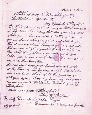 original spelling, capitalization, punctuation, etc.): "Aprile 25th 1855 State of Maryland Frederick County; John. H. Kuhn; His Love To Miz Hannah. C. Pryor;~ By these fiew lines I informe you that I am well at this time; And hoping that these fiew lines will finde you in the same state of helth; yet me~ an you are almost strangers; yet I will state to you that if we are almost strangers yet it is not said that we can not get acquainted if so your wish ma Be; And if my adreses are welcome to you Plese your honour i will heartiley Receive your answer to these Questions Its fare ase i know your friends are all well at this time. as the Evening is short I will close these fiew lines And if to this question you will ### agree; Plese my Dear Miz and sende me an answer to Wolfsville Frederick County Maryland; Aprile 25 1855 Yours With Respect John. H~ Kuhn; To: Miz Hannah Cornelia Pryor Bennevola Washington County Maryland"